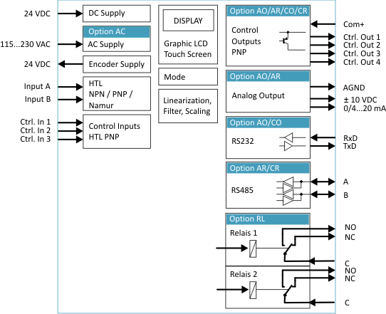 l 選項(xiàng)AC:電源115 — 230VAC l 選項(xiàng)AO:16位模擬輸出,4個控制輸出,串行RS232接口 l 選項(xiàng)AR:16位模擬輸出,4個控制輸出,串行RS485接口 l 選項(xiàng)CO:4個控制輸出,串行RS232接口 l 選項(xiàng)CR:4個控制輸出,串行RS485接口 l 選項(xiàng)RL:2個繼電器輸出