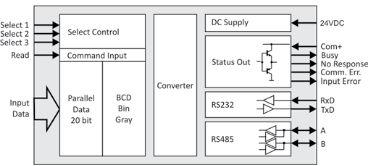 PR210 轉(zhuǎn)換并行BCD、二進制或格雷碼數(shù)據(jù)為串口RS232/RS485形式,它還有3個串行傳輸?shù)倪x擇輸入,可達8種不同目標單元。